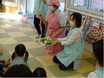 子どもたちに食育活動を通して、七草がゆのことを伝えました。