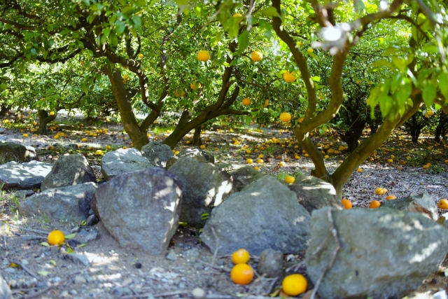 JAにしうわの「いよかん」は3つの太陽が育てると言われています。3つの太陽とは、①太陽の直射光 ②海からの反射光 ③石垣からの反射光のこと。さらに先代から伝わる3つの太陽に加え、近年は新たな取り組みとして地面に白いシートを敷いて散乱光を当てています。また、白いシートは畑に浸み込む雨水の量を調整する役割も果たしています。