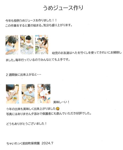 ちゃいれっく前田町保育園『うめジュース作り』 2024/8/6 せんむのにっき ちゃいれっく前田町保育園『うめジュース作り』のご様子です。 ご紹介したちゃいれっく前田町保育園詳しくは⇒こちらから 共有:クリックして Twitter で共有 (新しいウィンドウで開きます)Facebook で共有するにはクリックしてください (新しいウィンドウで開きます)いいね:いいね 読み込み中... 関連