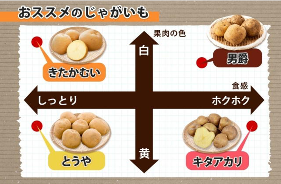 中の実が黄色く、気品のある味わいから「黄爵」という漢字があてられたのだとか。 男爵に比べるとでんぷん質は低いものの、芽が深くなく煮崩れしにくいのが特徴です。