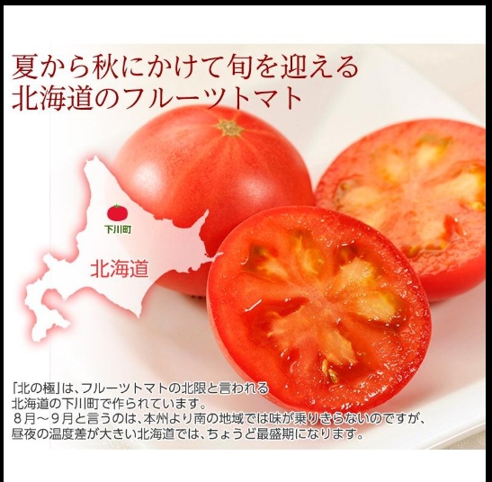 「北の極」は、北海道の夏に旬を迎えるトマトで、昼夜の気温差が大きい北海道の大地でゆっくりと熟成されてうまさが凝縮しています。また、水分を極限まで減らして栽培するため、果肉が凝縮し小ぶりで外皮はザクッと固めです。