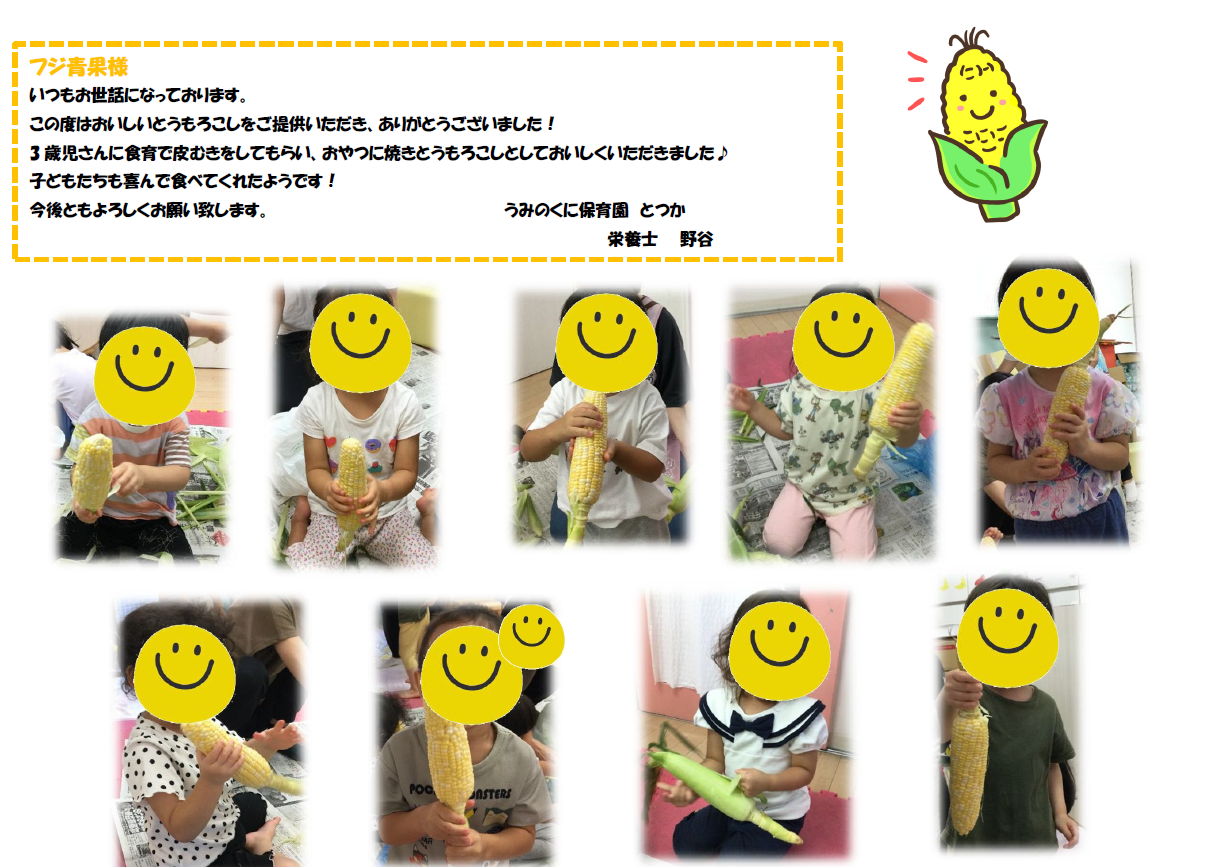 うみのくに保育園とつかさんの『とうもろこし皮むき』体験 2025/7/15 せんむのにっき うみのくに保育園とつかさんの『とうもろこし皮むき』体験のご様子が届きました。 ご紹介した『うみのくに保育園とつか』は詳しくは⇒こちらから 共有:クリックして Twitter で共有 (新しいウィンドウで開きます)Facebook で共有するにはクリックしてください (新しいウィンドウで開きます)いいね:いいね 読み込み中... 関連
